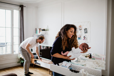 Et c'était peu dire. A peine un mois plus tard, je les retrouvais à trois pour une séance photo nouveau-né, toujours à leur domicile, pour de nouveaux souvenirs. Un beau bébé qui n'avait toutefois pas l'intention de laisser la séance se dérouler comme prévu. A neuf jours de vie, elle montrait déjà son caractère. J'était venu pour une séance mêlant photo de famille lifestyle et photo nouveau-né posing. Mais la partie posing s'est révélée extrêmement compliqué. Le petit ange ne voulait que téter, n'arrivait pas à s'endormir et surtout ne supportait pas d'être déshabillé et emmailloté. Ce n'est pas faute pourtant de lui avoir créé un environ adéquat, comme à l'habitude, avec un petit chauffage d'appoint pour ne pas qu'elle ait froid, et fait preuve de toute la douceur et patience possible. Cela arrive rarement. Même très rarement. Et il faut alors savoir l'accepter et improviser. Jamais je ne forcerai un bébé à faire ce qu'il refuse manifestement. Alors pour la toute première fois en huit ans d'activité, j'ai capitulé. Nous nous sommes contentés de photos lifestyle, et j'ai tout de même réussi à faire quelques photos de bébé seule en body, sur le plaid. Quelques unes endormies, durant ses cinq minutes d'assoupissement. Leurs souvenirs n'en sont pas moins beaux. Ils sont juste différents ce qu'ils avaient imaginé (voir les photos)